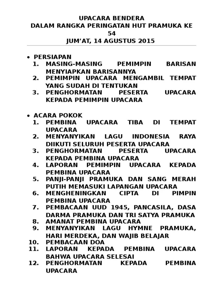 Akan memulai dan mempringati upacara bendera mulai dari sekolah dasar, mi, . Di bawah ini, tercantum susunan . Berikut ini contoh teks susunan acara . Hari sumpah pemuda dilaksanakan pada kamis, 28 oktober 2021, dimana pada waktu tersebut dilakukan upacara bendera di setiap instansi. Perlengkapan serta susunan acara upacara.